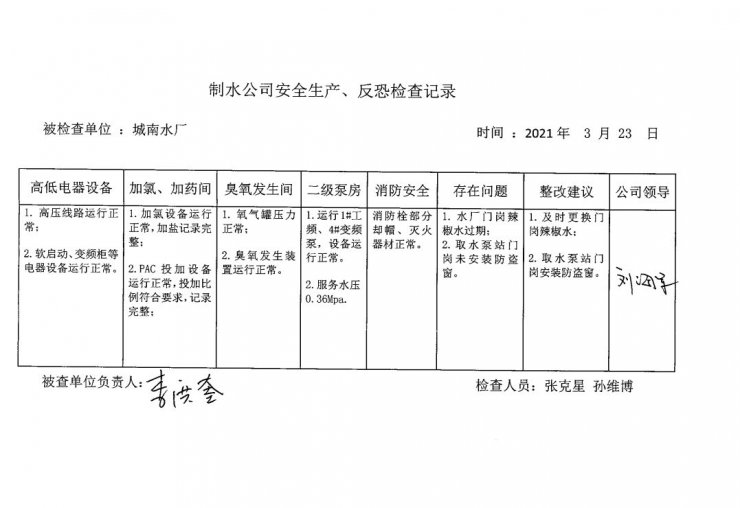 城南水厂2021年3月安全生产检查记录