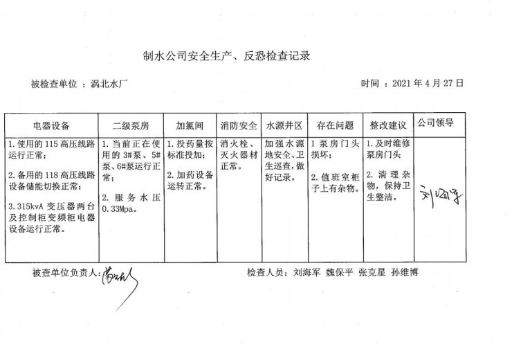涡北水厂2021年4月安全生产检查记录