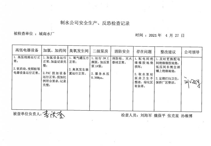 城南水厂2021年4月安全生产检查记录