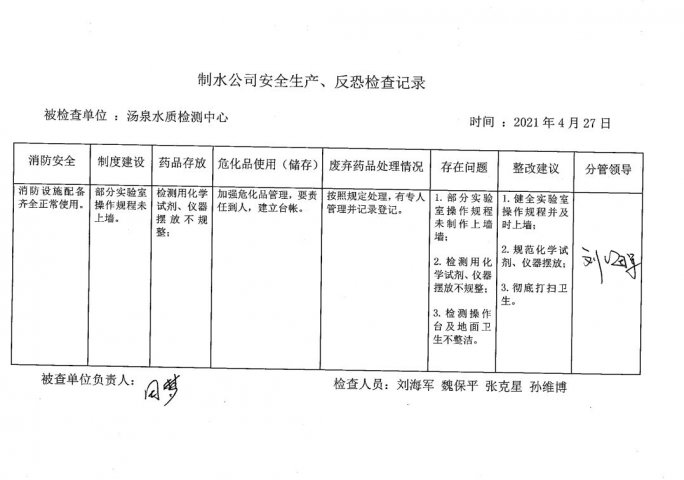 水质检测中心2021年4月安全生产检查记录