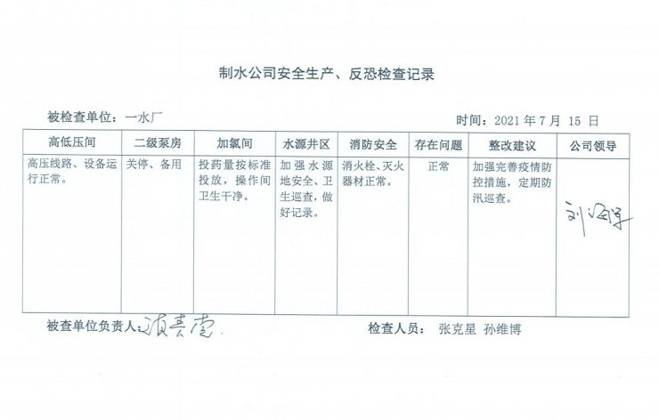 一水厂2021年7月安全生产检查记录