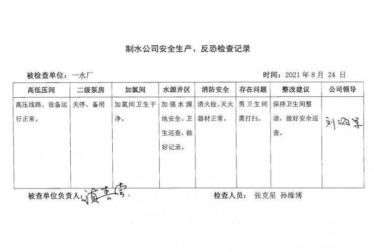 一水厂2021年8月安全生产检查记录