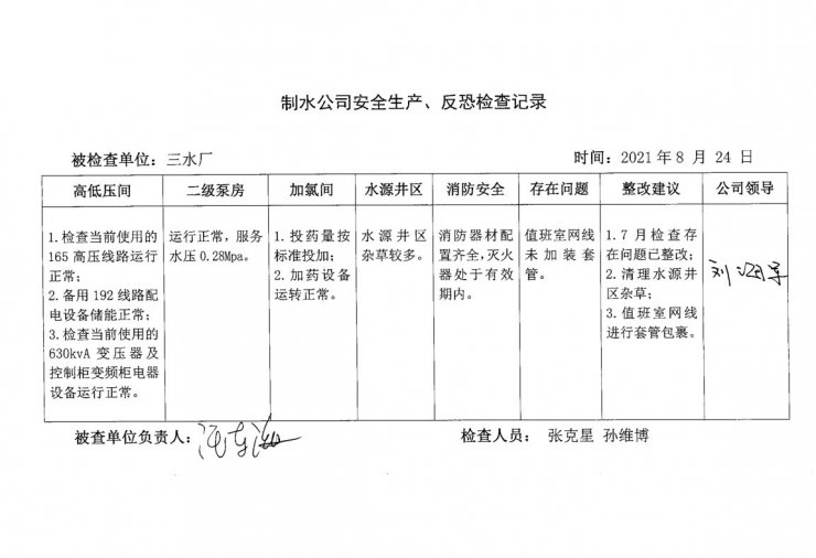 三水厂2021年8月安全生产检查记录