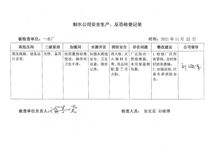 一水厂2021年11月安全生产检查记录
