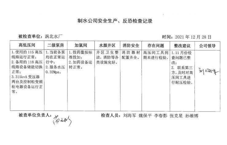 涡北水厂2021年12月安全生产检查记录