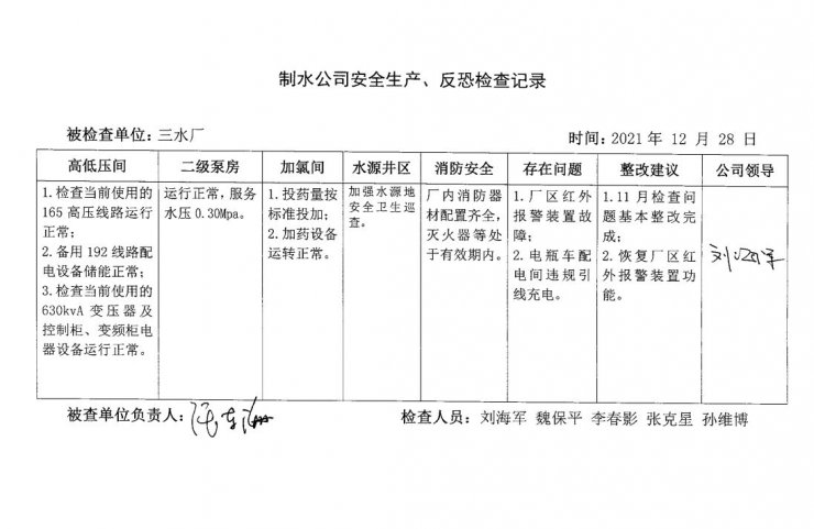三水厂2021年12月安全生产检查记录