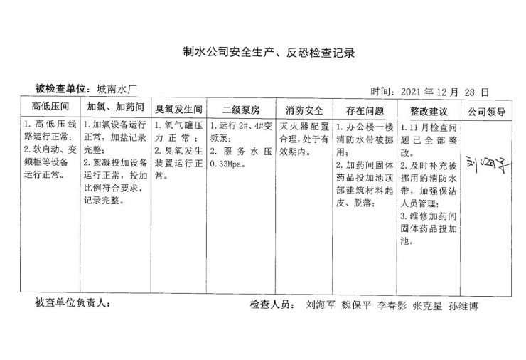 城南水厂2021年12月安全生产检查记录