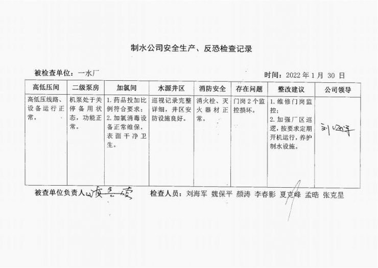 涡北水厂2022年1月安全生产检查记录