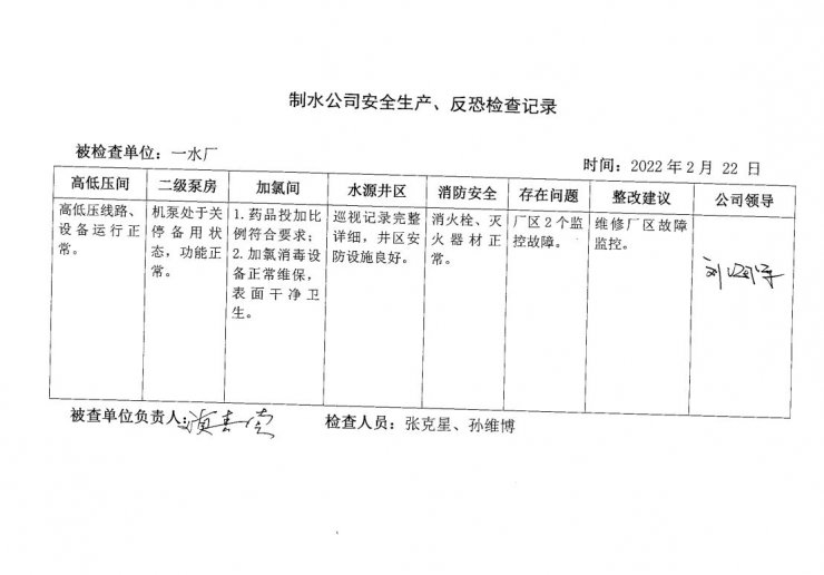 一水厂2022年2月安全生产检查记录