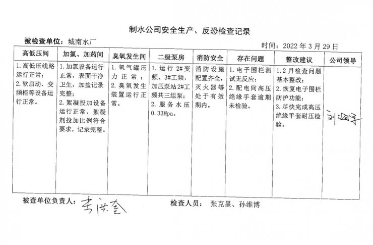 城南水厂2022年3月安全生产检查记录