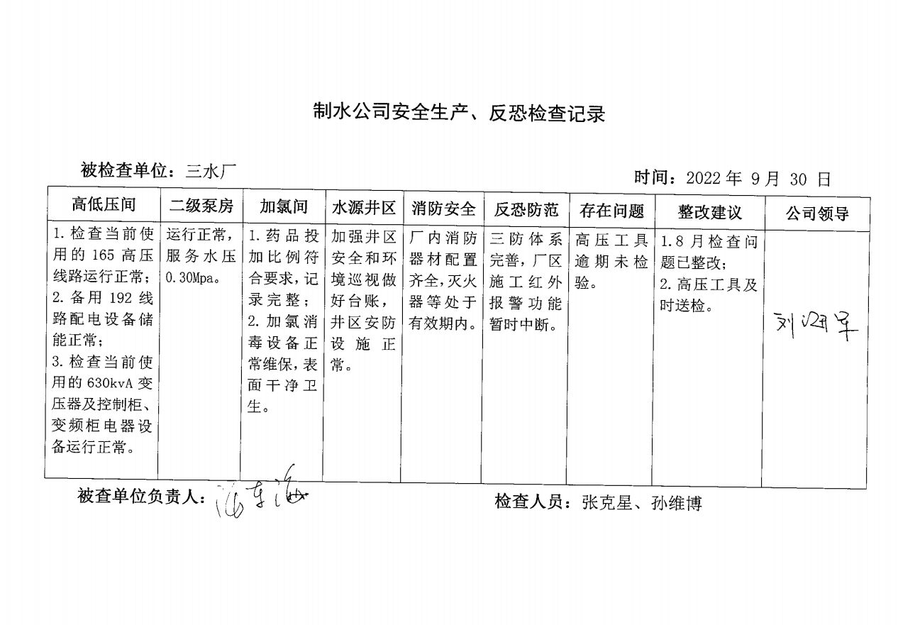 三水厂2022年9月安全生产检查记录