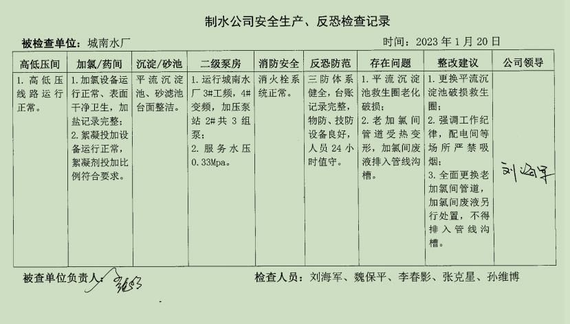 城南水厂2023年1月安全生产检查记录
