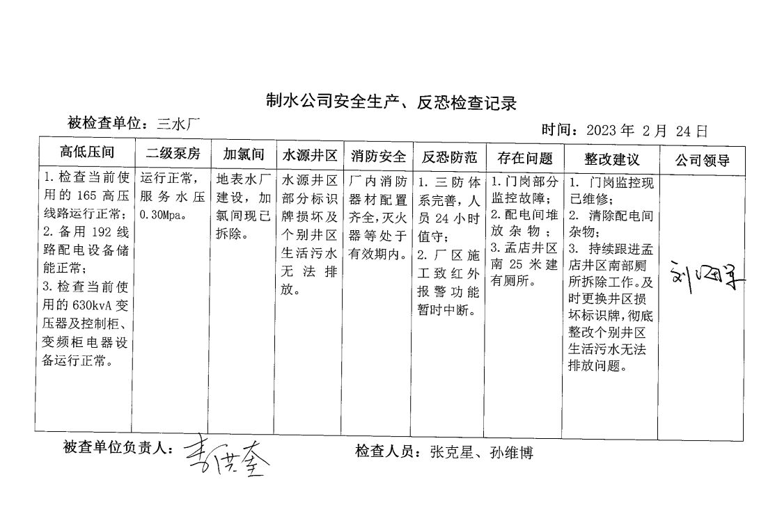 涡北水厂2023年2月安全生产检查记录