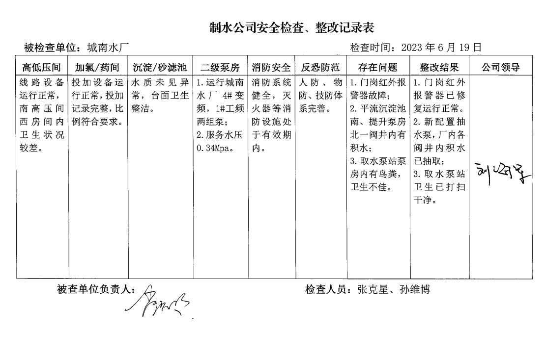 城南水厂2023年6月安全生产检查记录