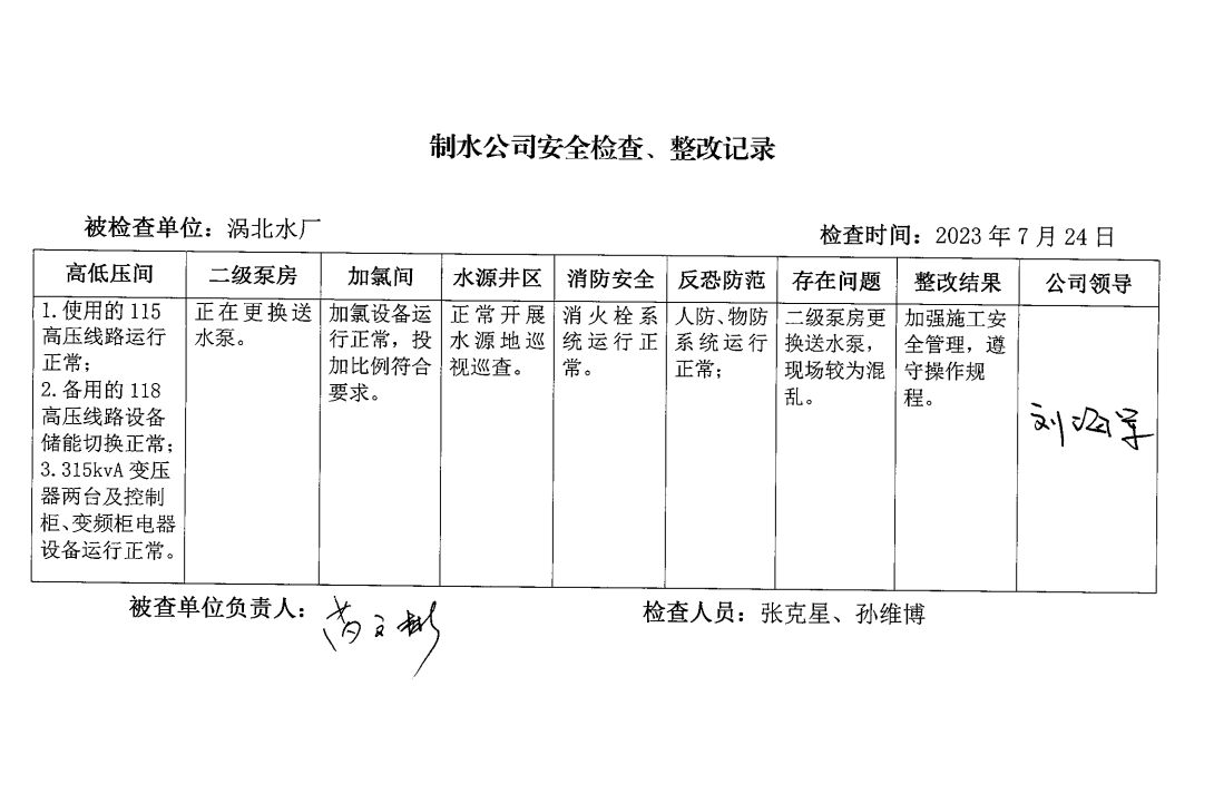 涡北水厂2023年7月安全生产检查记录
