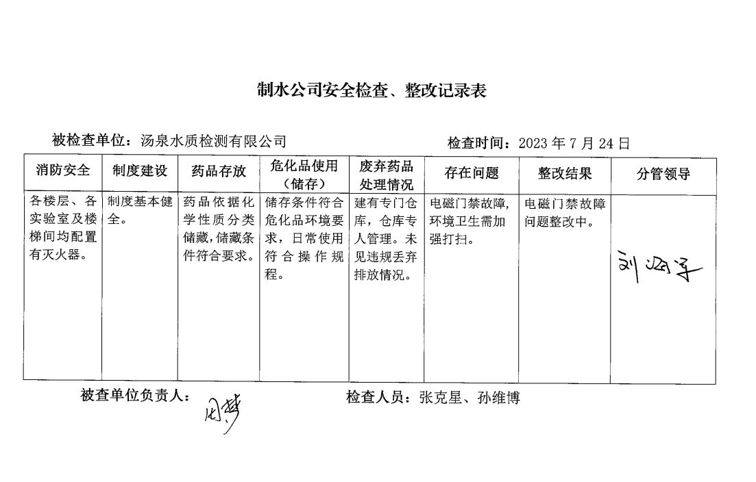 汤泉水质检测中心2023年7月安全生产检查记录