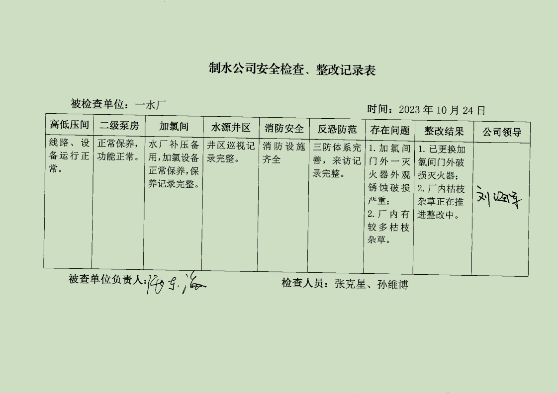 一水厂2023年10月安全生产检查记录