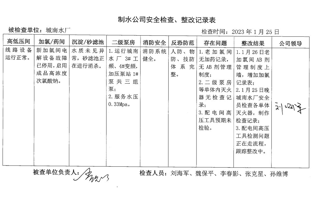城南水厂2024年1月安全生产检查记录