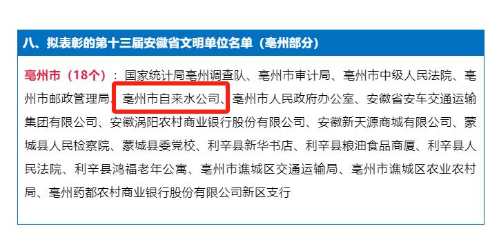 自2015年8月亳州市制水公司成立以来,在持续8年的文明创建过程中,制水公司及下属单位、科室和个人取得了累累硕果:亳州市谯城区放心消费示范单位,亳州市巾帼文明岗,亳州市职工职业道德建设标兵,亳州市“三八红旗手”荣誉称号,亳州市青年文明号2次,连续两届亳州市文明单位,安徽省住建系统青年文明号,安徽省住建系统学雷锋活动示范点3个、岗位学雷锋标兵3人次、“小水滴志愿者服务队”荣获学雷锋志愿服务品牌,全省五一巾帼标兵,全国住建系统劳动模范等等,不一而足。