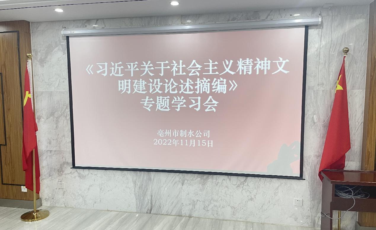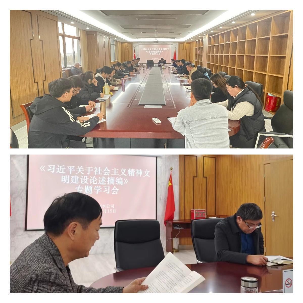 为深入学习贯彻习近平总书记关于精神文明建设的重要论述,高举思想旗帜、突出价值引领,制水公司组织党员干部、一线职工集体学习《习近平关于社会主义精神文明建设论述摘编》。