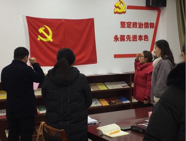 面对鲜红的党旗,全体党员起立,大会以雄壮的《国际歌》拉开序幕。支部书记魏保平同志首先宣读了局机关党委《关于对入党审批对象田梦同志审批结果的通知》和《关于对入党审批对象朱叶同志审批结果的通知》,向大会全体党员宣布两名同志正式加入制水公司党支部的大家庭中来,并要求继续做好两名同志预备期的培养教育和考察工作。随后由党支部组织委员刘海军同志带领两名新党员右手举拳,神情肃穆,声音洪亮,郑重宣誓,全体党员一起见证了这光荣而神圣的时刻。