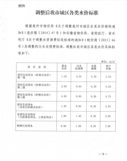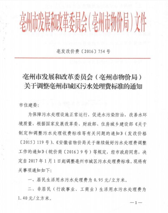 关于调整亳州市城区污水处理费标准的通知